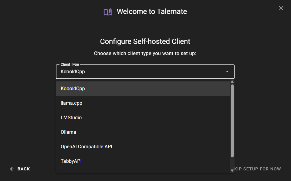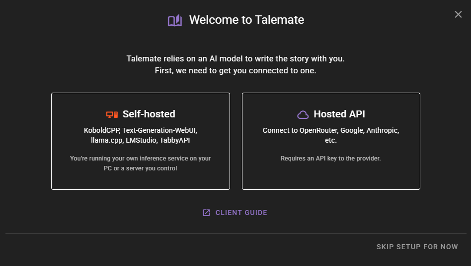 If you prefer to configure Talemate manually, you can click Skip setup for now at any time. The wizard will close and you can configure clients and settings through the regular interface.