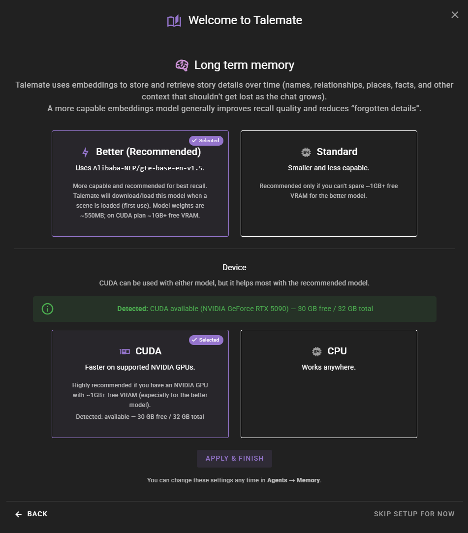 Uses the Alibaba-NLP/gte-base-en-v1.5 model. This provides more capable memory recall and is recommended for the best experience. The model weights are approximately 550MB and will be downloaded when you first load a scene. If using CUDA, plan for roughly 1GB or more of free VRAM.
