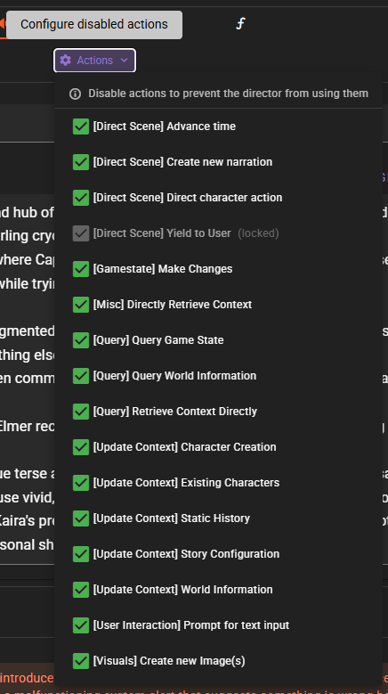 The Actions dropdown lets you enable or disable specific actions the director can use during scene direction. This gives you fine-grained control over what the director is allowed to do autonomously.