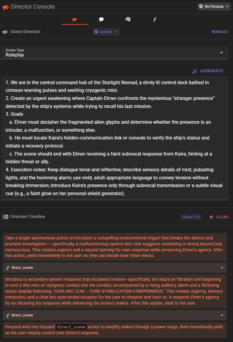 The director persona selected in the agent settings applies to scene direction as well as director chat. Choosing a different persona can significantly affect the director's tone, decision-making style, and how it approaches scene progression.