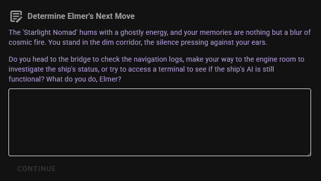 The director can prompt you for information during autonomous scene direction using the Prompt for text input action. This allows the director to request your input when it needs guidance or information to continue the story.