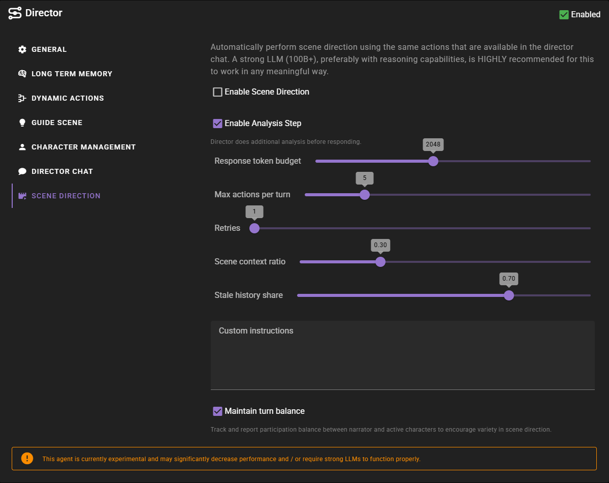 When Scene Direction is enabled, the director analyzes the scene after each turn and decides whether to take action. The director can: