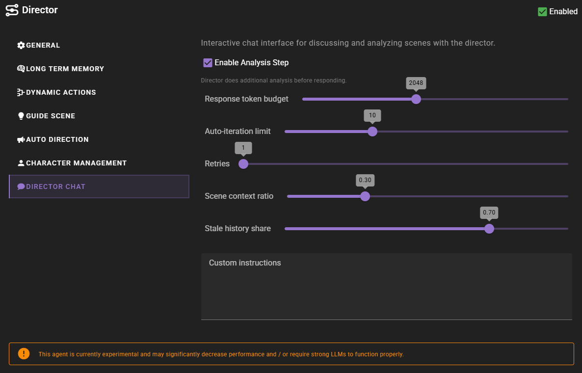 When enabled, the director performs an internal analysis step before responding. This helps the director think through complex requests and plan actions more carefully.