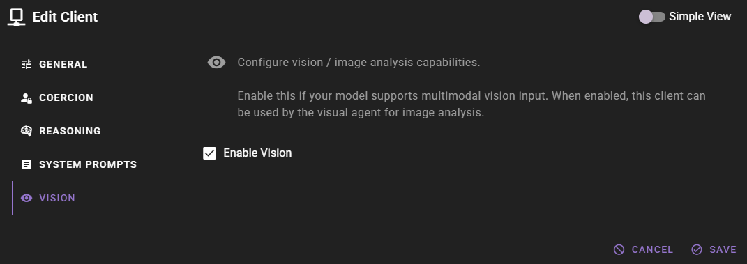 Only enable vision if the model currently loaded on the client actually supports multimodal vision input. For local models this generally means a mmproj (multimodal projector) file was loaded alongside the model. Enabling vision on a text-only model will result in errors when image analysis is attempted.