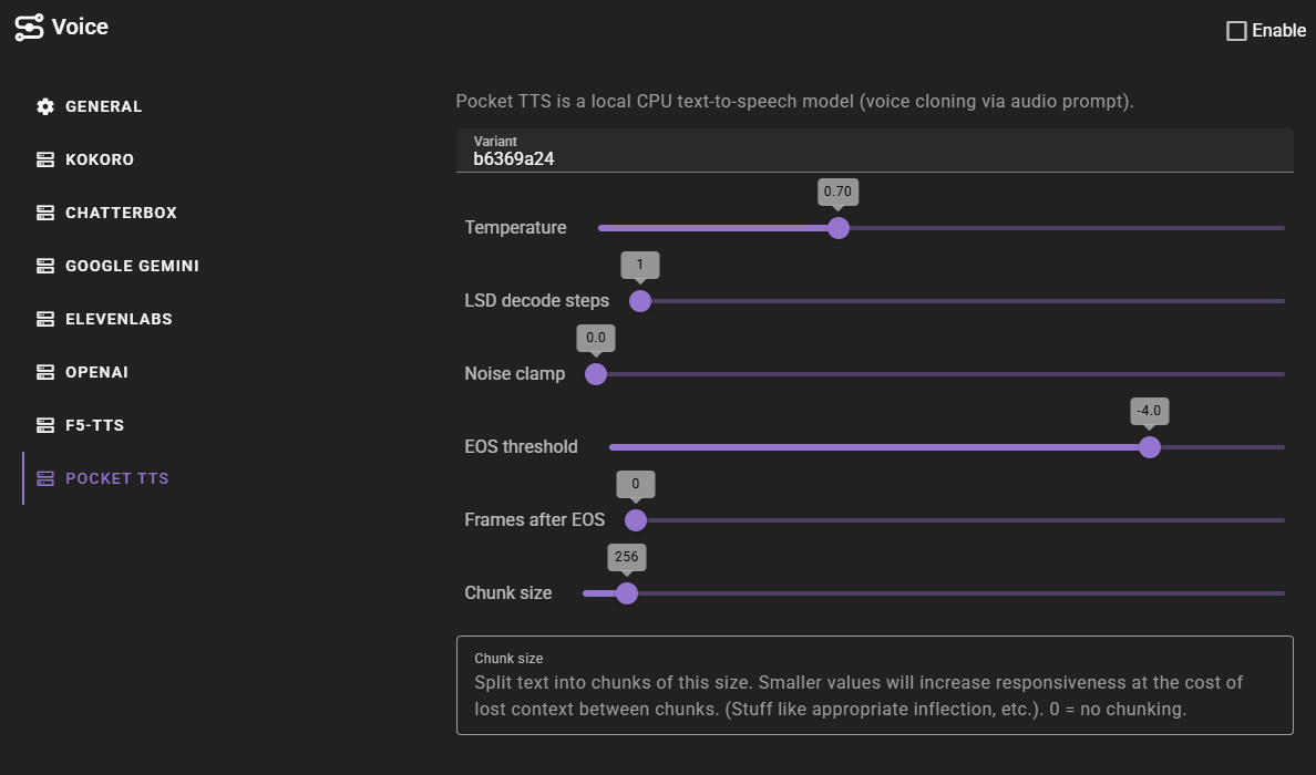 Text is split into chunks of this size for processing. Smaller values increase responsiveness but may affect natural flow between chunks. 0 disables chunking. Default is 256.