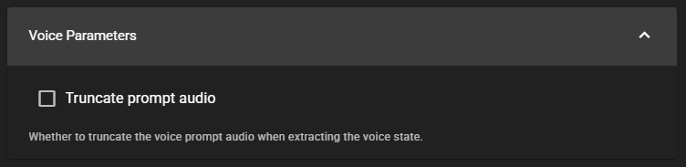 When enabled, truncates the voice prompt audio to 30 seconds when extracting the voice characteristics. This can help prevent memory issues with very long audio samples.