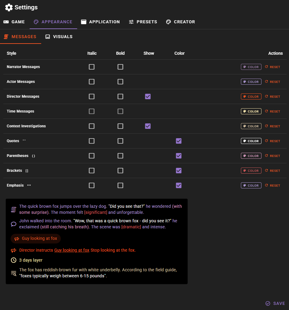 The Messages tab gives you control over how text appears in the scene feed. You can customize the styling for different message types and special text formatting.