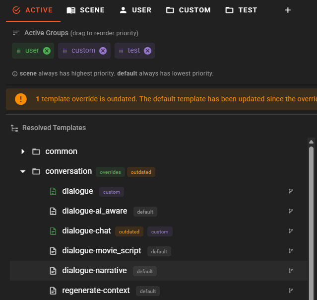 - Outdated indicator -- if a default template has been updated more recently than your override, it is flagged as potentially outdated. This is especially important after upgrading Talemate, as default templates may have changed