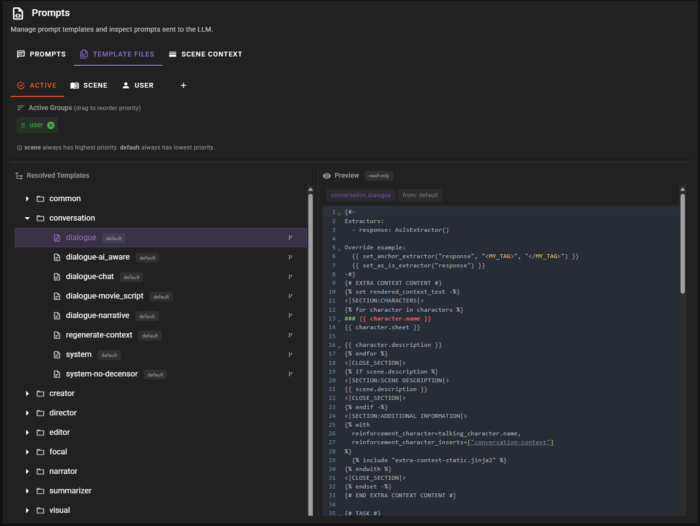 Templates are organized into groups that control override priority. Each group is a collection of Jinja2 template files organized by agent (narrator, director, conversation, etc.).