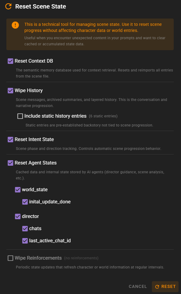 The Reset Scene State dialog provides granular control over clearing and resetting various components of your scene's internal state. This is a technical tool for managing scene data -- it allows you to reset scene progress without affecting character definitions or world entries.
