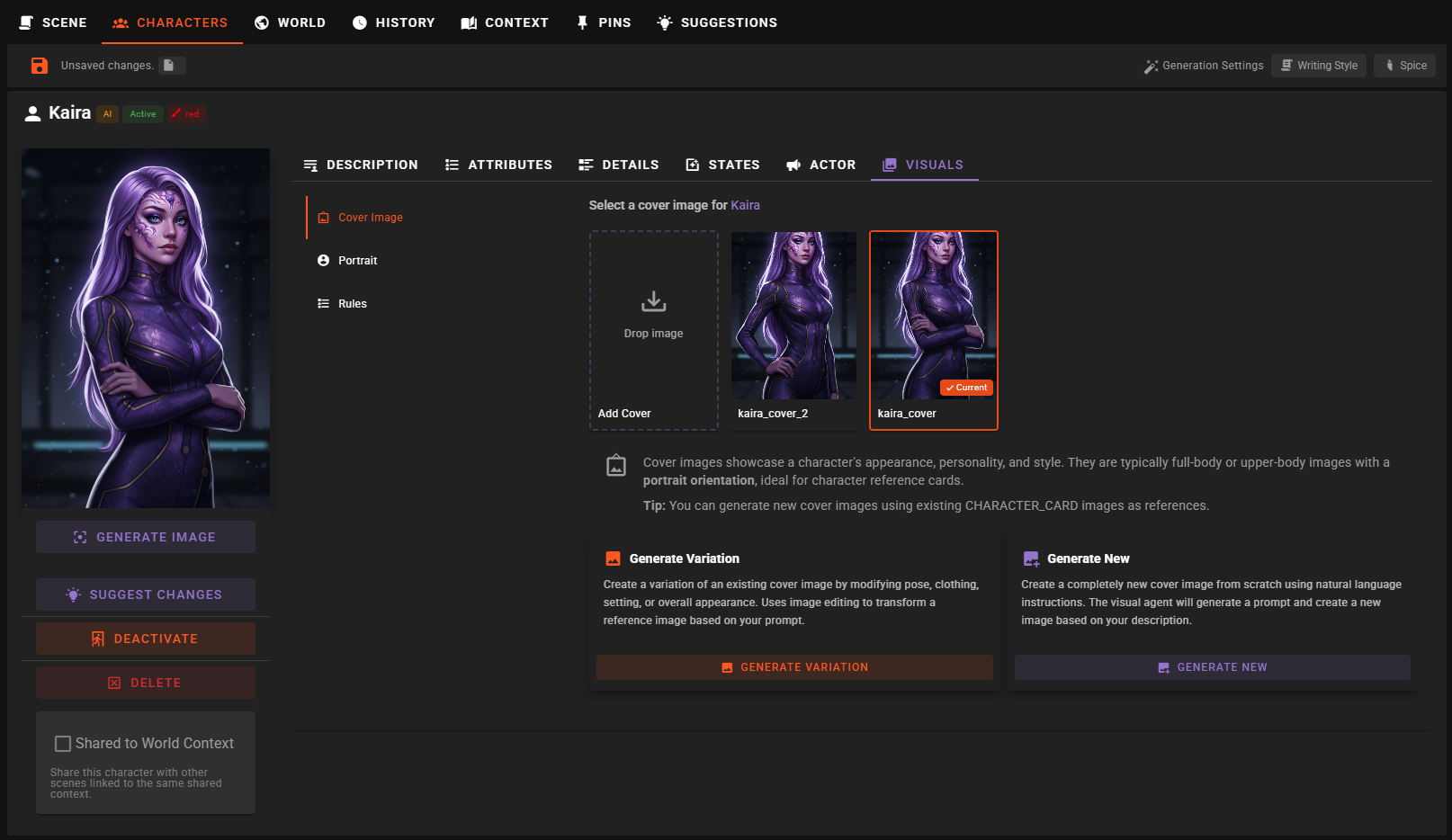 The Visuals tab in the Character Editor provides a dedicated interface for managing all visual assets associated with a character, including portraits and cover images. This feature makes it easy to organize, generate, and iterate on character imagery without needing to navigate through the full Visual Library.