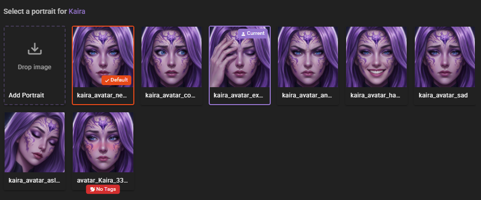 Once you have at least 2 portraits for a character, the World State Agent can automatically select the most appropriate portrait based on the current moment in the scene.